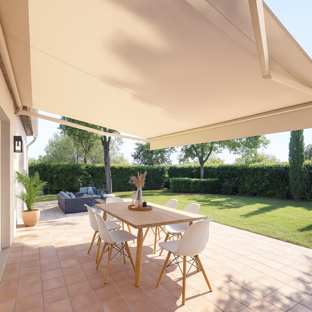 Le choix du coloris de la toile a toute son importance sur ce modèle de store sans coffre. En effet, la toile est visible en permanence et apporte une touche de déco supplémentaire à votre façade.